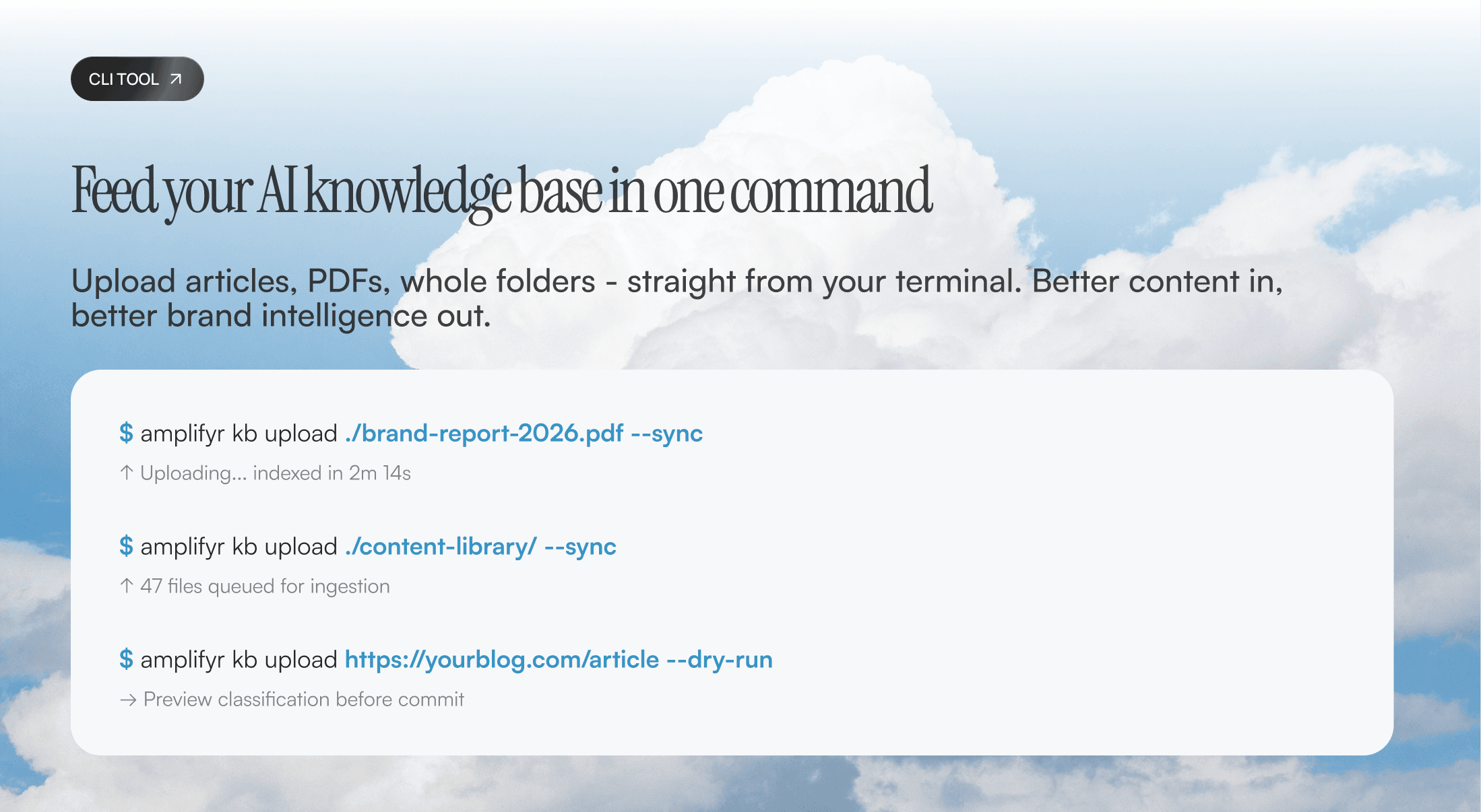 The Amplifyr CLI is a simple tool your team runs from the terminal to add content to Amplifyr’s Knowledge Base.